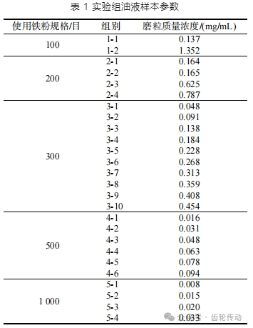 實(shí)驗(yàn)組將不同細(xì)度規(guī)格的鐵粉顆粒與未使用的 320 號(hào)工業(yè)齒輪油以不同比例進(jìn)行配比作為待測(cè)油液樣本。所使用鐵粉顆粒的細(xì)度規(guī)格分別為 100、200、300、500 和 1 000 目,該細(xì)度規(guī)格僅作為鐵粉細(xì)度的大致參考。在待測(cè)油液樣本的具體配置過(guò)程中,控制每次油液容積均為 400 mL,改變加入其中的鐵粉規(guī)格及質(zhì)量使每組油液樣本中所含磨粒的大小和濃度均不同,具體組別與配比情況見(jiàn)表 1。