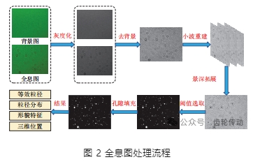 采集到潤(rùn)滑油中的顆粒全息圖后,需先對(duì)全息圖進(jìn)行一系列圖像處理才能獲取所需要的顆粒信息,其主要過(guò)程為去噪、小波重建、景深拓展、顆粒識(shí)別、孔隙填充等。全息圖處理具體流程如圖 2 所示。