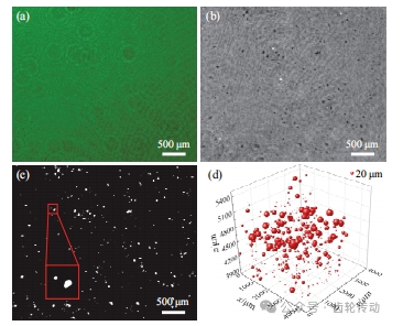 圖 3 (a)原始全息圖;(b)景深拓展圖;(c)二值化圖像;(d)磨粒在測(cè)量體積內(nèi)的三維分布