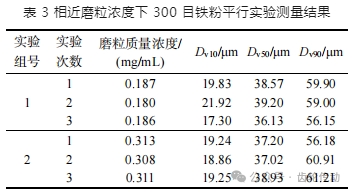 考慮到 300 目鐵粉本身存在一定的粒度分布差異,每次取樣可能存在一定的粒度偏差,因此對(duì)相近磨粒濃度的油液進(jìn)行了平行實(shí)驗(yàn),其結(jié)果見(jiàn)表 3。其中,第一組平行實(shí)驗(yàn)中的第三次實(shí)驗(yàn)所測(cè)得的 Dv10、Dv50和 Dv90指標(biāo)均略小于其他兩次實(shí)驗(yàn),第二組平行實(shí)驗(yàn)中的第一次實(shí)驗(yàn)測(cè)得的 Dv90 指標(biāo)也略微偏小。這證實(shí)了相同磨粒濃度下,不同次取樣的鐵粉存在一定的粒度差異,會(huì)導(dǎo)致最終測(cè)量結(jié)果相近但不完全相同。