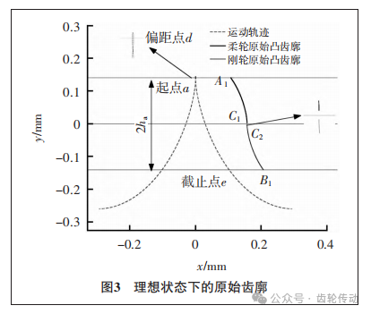 用上述的方法同樣可以求解剛輪凹齒廓,基于柔輪的運動軌跡,通過柔輪凸齒廓求解剛輪的共軛凹齒廓。