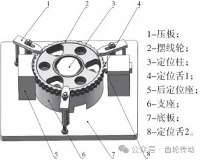 擺線輪的外協最后一道工序為熱處理,粗加工給精加工的端面預留量為0.1mm,由于熱處理后工件會不可避免的發生變形,如果精加工采用直接吸在磨床上進行平磨,會導致工件的形位公差超差,進而影響后續的工序加工。因此,需要設計一套工裝(圖3)來完成此工序的加工。此工裝利用標準的三爪卡盤改造,只需更換特制的卡爪即可,擺線輪在裝夾時,需保證每個卡爪的圓弧面與2個以上的擺線齒接觸。圖中的調整塊可以快速的調整擺線輪裝夾時的平面度,擺線輪夾緊后取掉調整塊進行磨削加工。工裝的夾緊力控制在5N·m,工件在裝夾后幾乎不會發生彎曲變形,可以保證擺線輪在第一面磨削完成松開后,加工面不會發生彎曲變形,磨第二面時便可以將第一面直接吸在磨床平臺上即可,不需要互為基準的多次磨削。要求平磨后擺線輪兩平面的平行度為0.01mm。