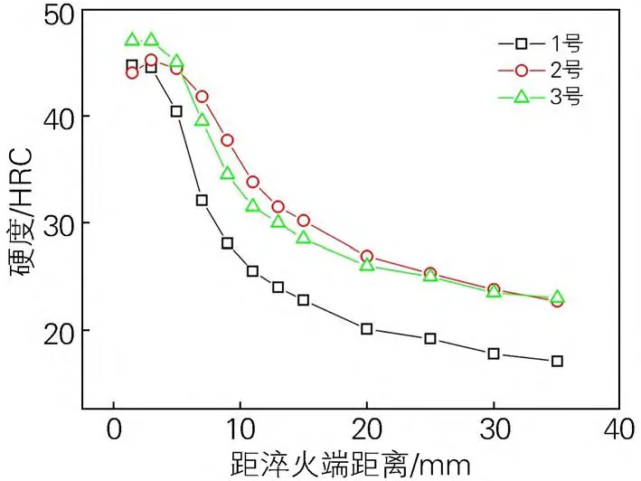 3種試驗(yàn)鋼中,3號(hào)鋼的淬火端硬度最高,2號(hào)鋼的淬透性曲線斜率變化最小,而1號(hào)鋼的淬透性最低,其距淬火端3mm以上位置的硬度均明顯低于其他2種試驗(yàn)鋼。