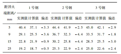 1號(hào)鋼距淬火端5、9mm位置的淬透性計(jì)算結(jié)果與實(shí)測(cè)結(jié)果偏差較大,分別為3.3HRC和3.6HRC,而15、25mm位置的計(jì)算結(jié)果偏差相對(duì)較小,均在1HRC以內(nèi);2號(hào)鋼典型位置淬透性的計(jì)算值與實(shí)測(cè)值偏差均較大,都超過(guò)了2HRC,且距淬火端9、15mm位置的偏差都達(dá)到了4.4HRC;3號(hào)鋼典型位置淬透性偏差在1.8~3.0HRC之間,最大淬透性偏差在距淬火端15mm處。