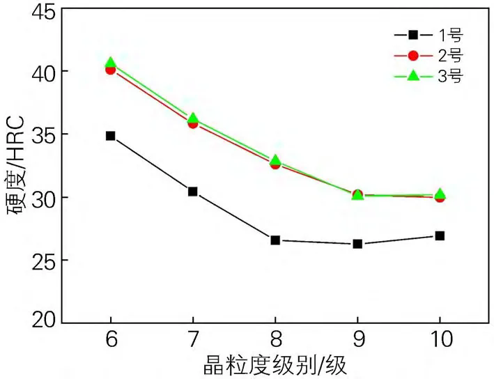 從圖5可以看出,隨著3種齒輪鋼晶粒度級(jí)別的增加,距淬火端9mm位置硬度整體呈現(xiàn)下降的趨勢(shì),晶粒度8~9級(jí)以下時(shí),距淬火端9mm 位置硬度隨晶粒度等級(jí)的增加快速下降,而晶粒度級(jí)別較高時(shí),硬度變化變緩,趨于穩(wěn)定。