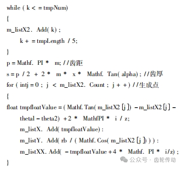 多功能試驗(yàn)系統(tǒng)底層算法數(shù)學(xué)建模:通過數(shù)學(xué)建模工具 AlgDesigner V3.0 的二次開發(fā),將齒輪幾何參數(shù)、基本尺寸計(jì)算及輪廓線生成編譯轉(zhuǎn)化為底層運(yùn)算代碼,為程序調(diào)用提供底層數(shù)據(jù)支撐,實(shí)現(xiàn)齒輪機(jī)構(gòu)尺寸自動(dòng)化計(jì)算功能。以下是編寫的部分齒輪輪廓線自動(dòng)生成的底層算法數(shù)學(xué)建模代碼段。