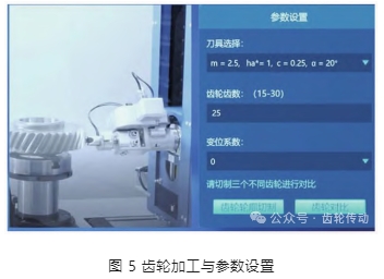 該模塊可將(1) 中設(shè)計(jì)的齒輪,通過加工刀具參數(shù)的設(shè)定、目標(biāo)齒數(shù)設(shè)定及齒輪變位系數(shù)的設(shè)定,即可實(shí)現(xiàn)對(duì)設(shè)計(jì)齒輪的制造,呈現(xiàn)齒輪的加工過程與制造方法。如圖 5 所示,選擇刀具參數(shù): m = 2.5,齒數(shù) z = 25,變位系數(shù) = 0,ha* = 1,c = 0.25,α = 20°,點(diǎn)擊“齒輪輪廓切制”,即可實(shí)現(xiàn)對(duì)設(shè)計(jì)齒輪的切制加工,并呈現(xiàn)齒輪加工過程。通過改變齒輪加工的參數(shù)設(shè)置,可對(duì)不同參數(shù)下的加工齒輪進(jìn)行對(duì)比分析與研究,從而選擇最優(yōu)齒輪加工參數(shù),實(shí)現(xiàn)了三維空間下對(duì)設(shè)計(jì)的齒輪進(jìn)行虛擬加工制造過程仿真。