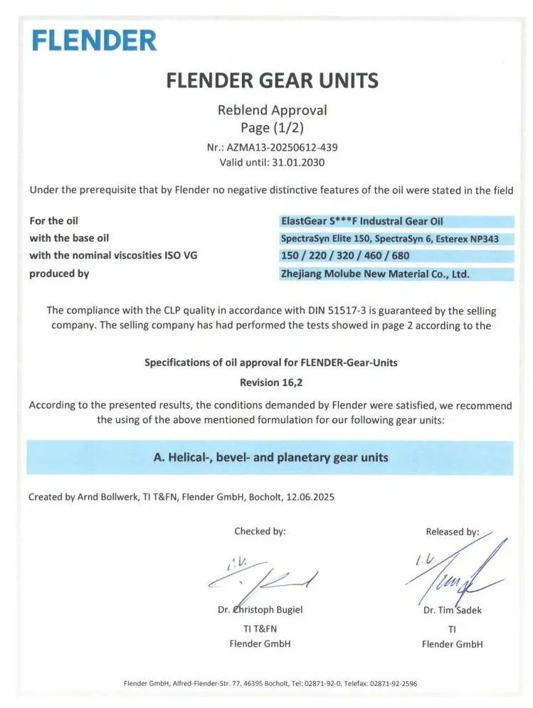 近日,浙江摩路新材料有限公司核心產品高性能工業齒輪油系列,憑借其持續穩定的卓越性能和對設備的長效可靠保護,再次成功通過了國際傳動領域權威FLENDER弗蘭德的嚴苛審核,榮獲其官方再認證證書!這不僅是一份榮譽,更是對摩路新材料長期堅持品質與技術創新的有力印證,也承載著我們對客戶的堅定承諾。