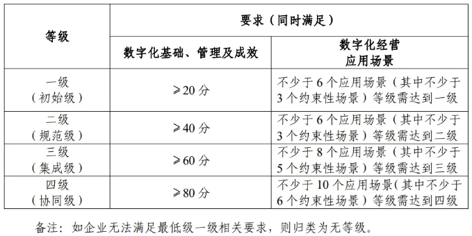 《評測指標(biāo)(2024年版)》依據(jù)數(shù)字化基礎(chǔ)、管理及成效評測得分和數(shù)字化經(jīng)營應(yīng)用場景等級判定(須同時滿足兩部分要求),將中小企業(yè)數(shù)字化水平劃分為4個等級:一級(初始級)、二級(規(guī)范級)、三級(集成級)、四級(協(xié)同級)。